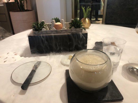 I chose a six course tasting menu with wine pairings, and the sommelier, who’s name is Vino (not kidding, that’s actually his name), cheerfully agreed to do half pours for me so I wouldn’t pass out at the end of lunch. The staff was super friendly, and the food was absolutely exquisite. My favorite dish was a rosemary smoked egg paired with a white, almost sherry-like wine from the Jura. Here’s Vino with the wine, and the egg presentation: