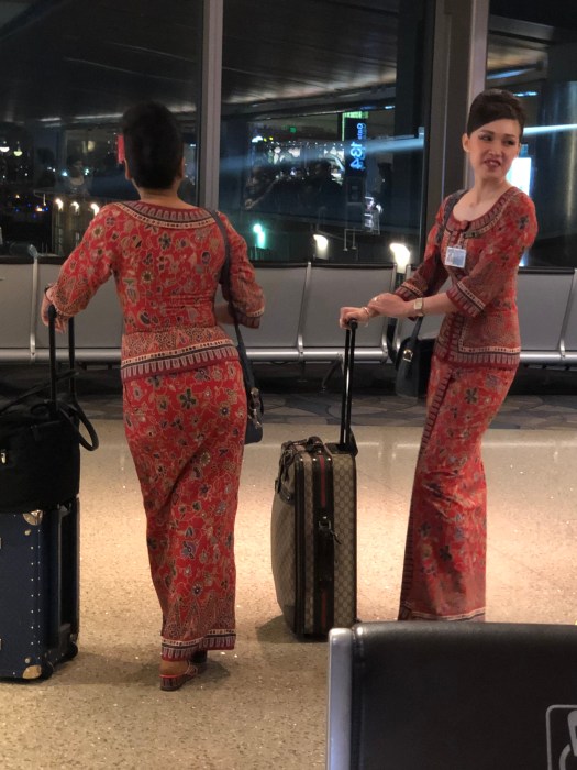 An interesting little side note about the flight attendants – I chatted with the flight manager for a bit (I think I was the only passenger still up), and she filled me in on their absolutely gorgeous uniforms. The colors are representative of their rank: green and blue are younger, newer, lower ranking attendants (I forget in what order), Red is a step up, and purple is the flight manager. They were designed by Pierre Cardin 50 years ago and haven’t changed since. I took a photo of these two ladies at the gate before we left LAX: