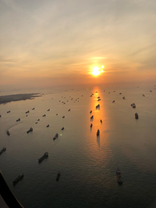This was the view from the plane as we landed in Singapore yesterday …. the port is essentially the world’s staging area for shipping, those are all cargo ships. I find that hard to wrap my brain around (in addition to the fact that it’s tomorrow here) – goods bound for countries all over the world are waiting in containers stacked on HUGE ships here in these waters, pending delivery to the rest of the globe.