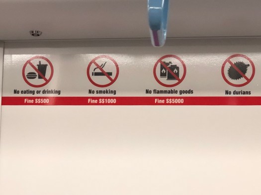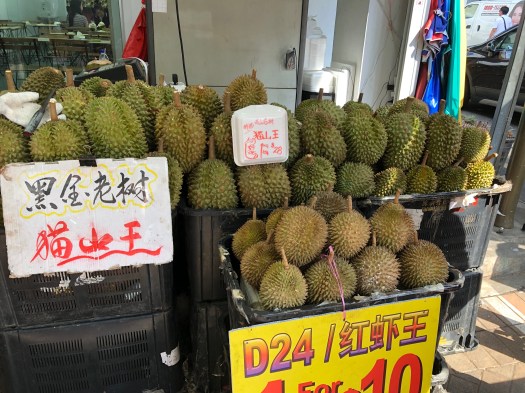 First, a snack gets you a $500 fine? Second, durian fruit is so popular here that they have to ban it. Durian is the foulest smelling thing you can imagine… I had been told about it, but had never actually smelled it until I ran across this stall in Chinatown. I could smell them ten feet away: