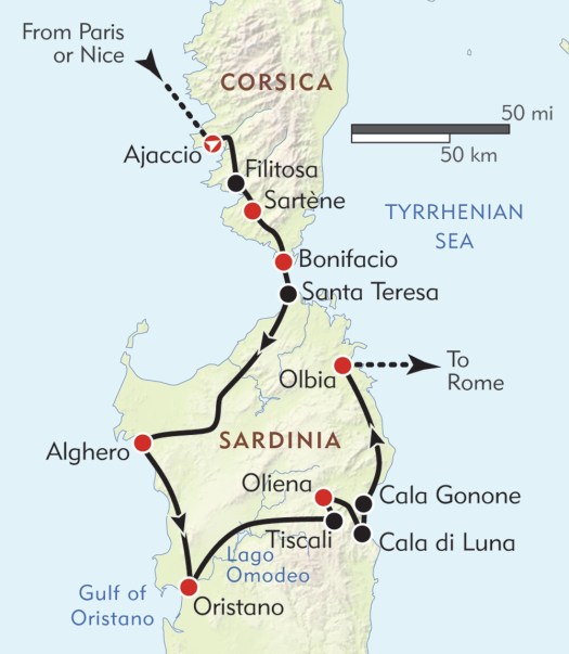 I’ll be taking a long taxi ride, about 2 1/2 hours, down to Ajaccio later this morning, where I’ll meet up with my hiking group for the rest of the trip. Our route is below, and we’ll spend two nights in each of the red-dot towns.